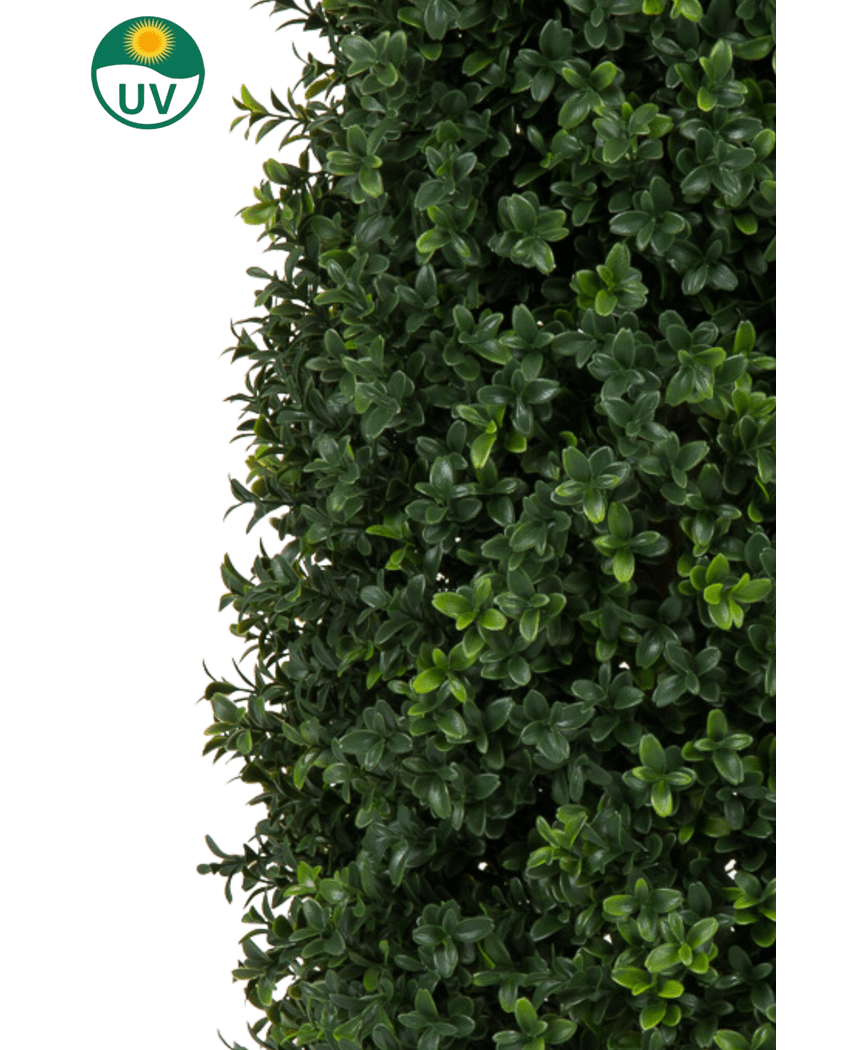 - Tæt og livagtigt løv: Vores buksbom har et unikt løv i en dyb, rig grøn farve, kombineret med lysere blade, der simulerer ny vækst.