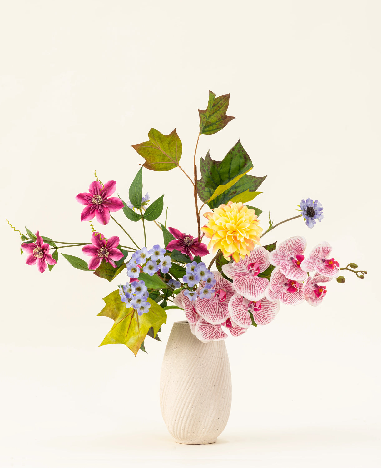Den dybt farvede Clematis dobbelt og den rige orkidé Real Touch i Fuchsia og Purple giver en slående farvekontrast, mens Dahlia Real Touch in Champagne er en blød, lysende modstykke. Det generøse tulipanblad og bregne grene bringer naturlig dybde og struktur til buketten og styrker haven -lignende karakter.