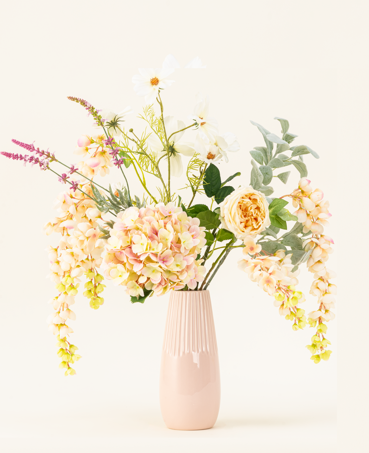 Den yndefulde Wisteria i fløde danner en elegant øje -fangst, mens White Cosmos og Purple Lavender giver en frisk sommermøtrik. Eucalyptus bringer struktur og et strejf af grønt, og den smukke gartner "Anniken" Real Touch i Soft Yellow afslutter den med et strejf af klassisk charme.