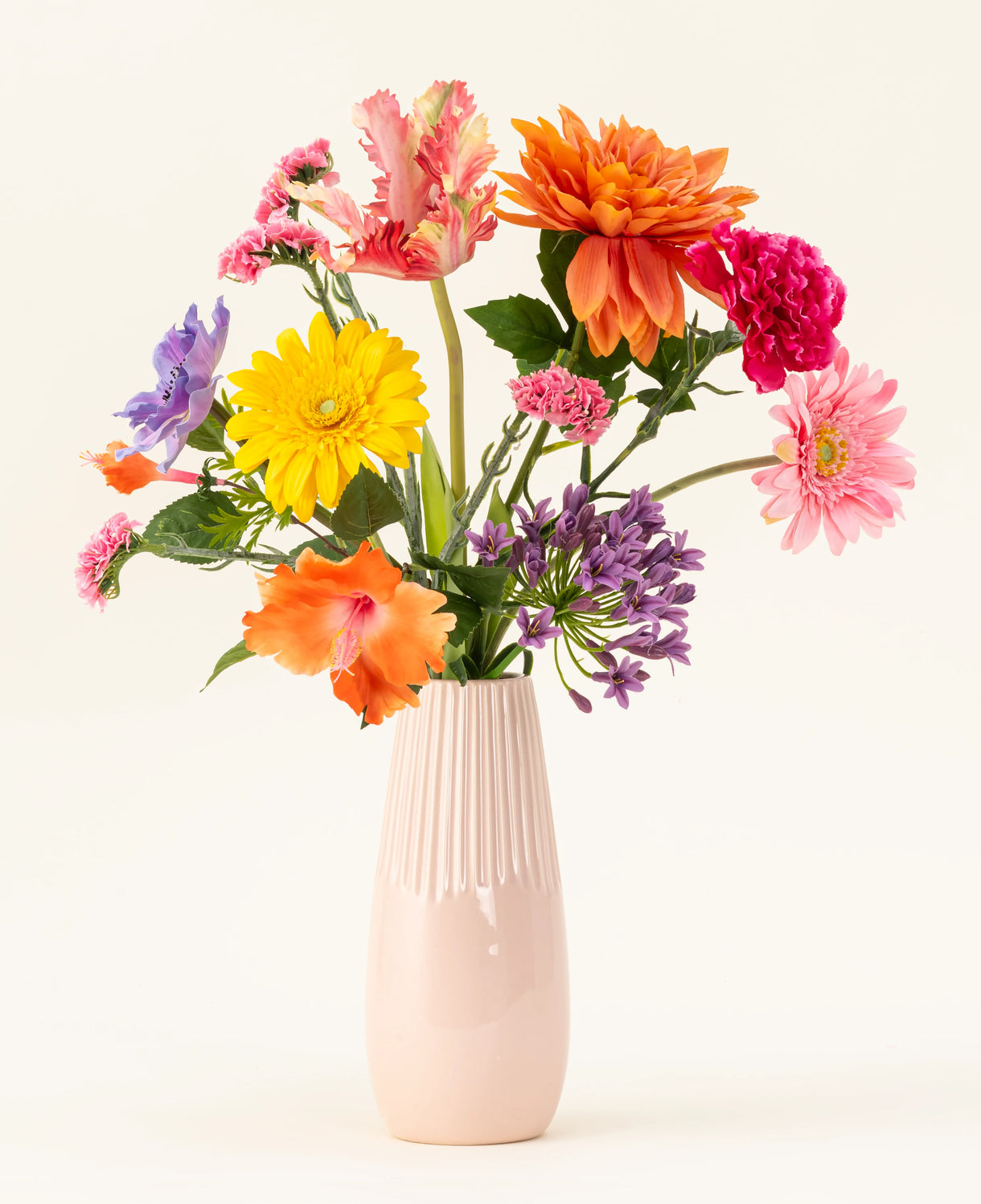 Buketten indeholder den slående agapanthus og anemone deluxe i lilla, den tropiske hibiscus og georgine virkelige berøring i orange og den udtryksfulde nellik i hård lyserød. Derudover finder du blød lyserød og solrige gule gerberas, luftige statice -grene og den unikke franske parakeet -tulipan...