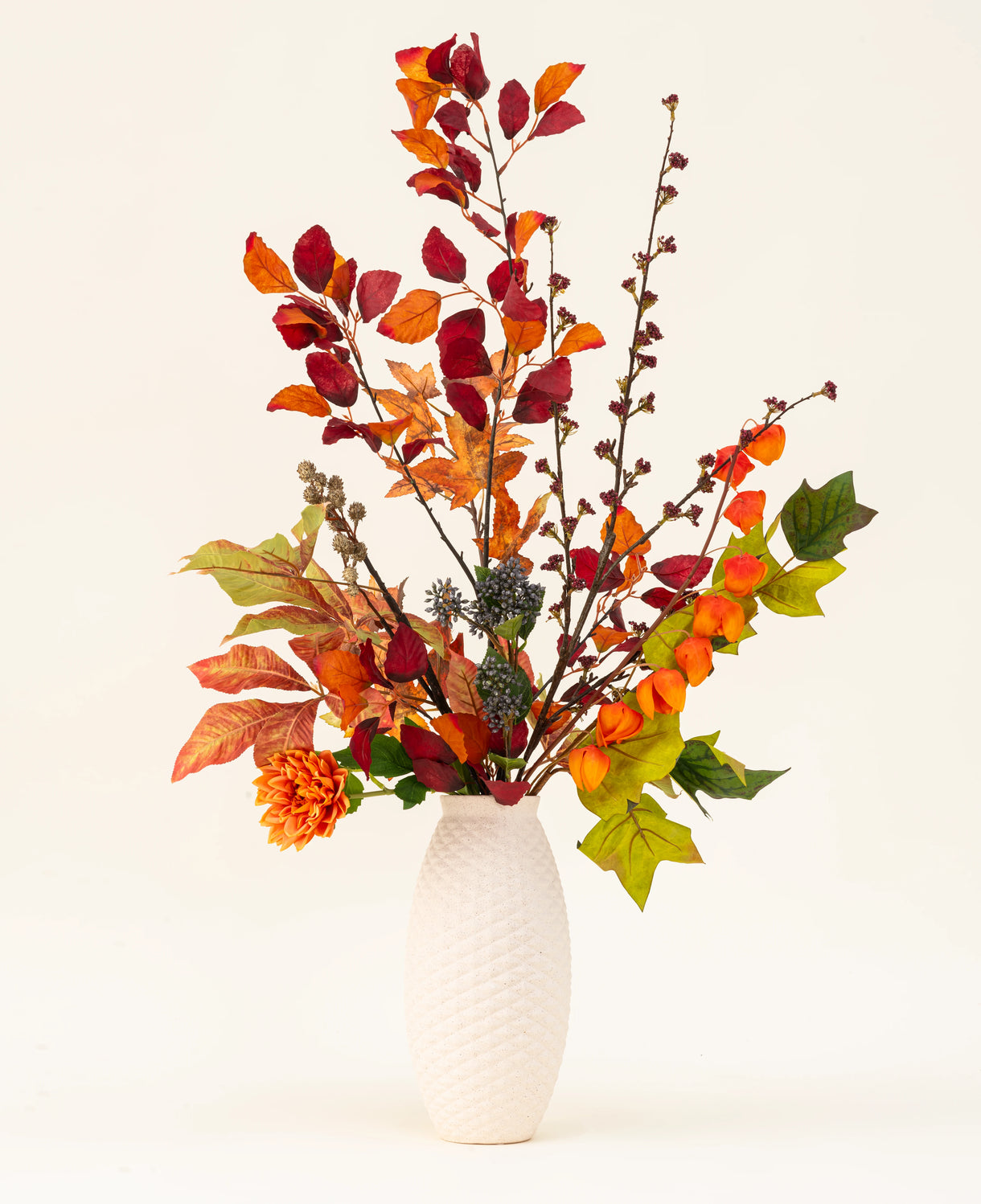 Chestnut Charm bringer de rige farver og teksturer i efteråret til livet i en stilfuld silkebuket. Med dybe røde og orange toner, robuste blade og legende bærstrukturer fremkalder dette arrangement følelsen af en skovvandring i oktober sol. Et kraftfuldt, men raffineret stykke, der tilføjer varme og karakter til hvert værelse uden at dominere.