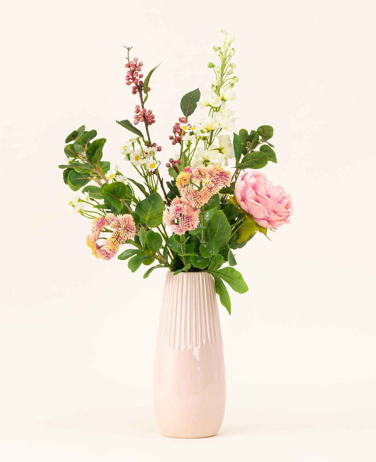 Daisy Charm er en silkebuket, der samler friskhed og naturlig elegance. Med en harmonisk blanding af lyserød, hvid og grøn udstråler dette arrangement blødhed og livlighed. Perfekt til dem, der kan lide et friskt, romantisk look og en tidløs dekoration, der bringer varme og forfining.