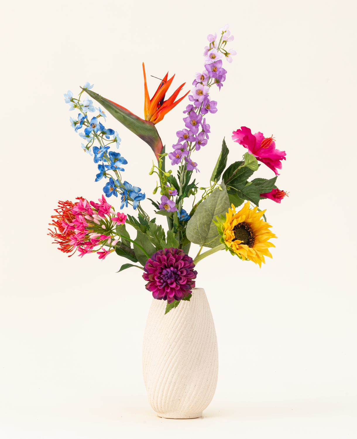 Dahlia i lilla danner sammen med delphinium et stilfuldt, lodrette grundlag i både lilla og blå. Den lyserøde hibiscus og agapanthus tilføjer et blødt og romantisk touch, mens den magtfulde protea og slående strelitzia i rød/lilla giver en eksotisk kant. Zonnebloem Real Touch bringer en varm, solrig note og en realistisk finish, der...