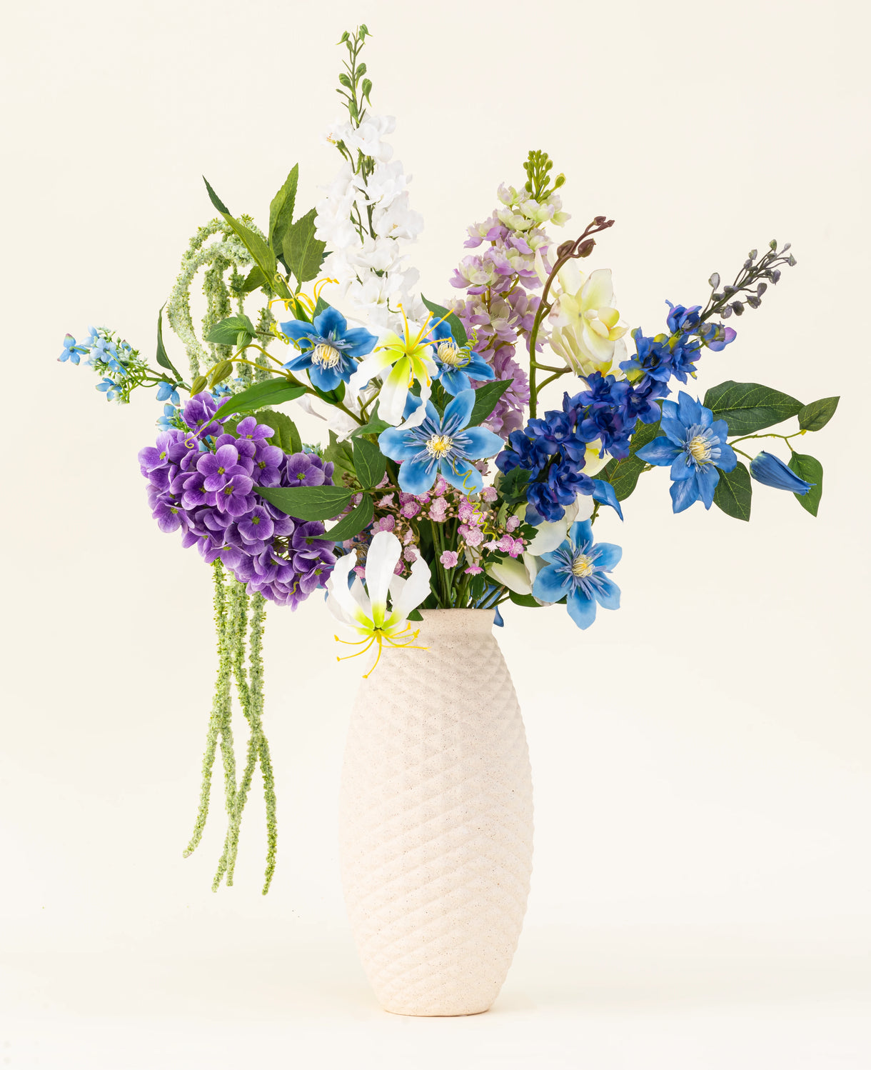 I denne buket finder du blandt andet den yndefulde violin, Delphinium, Orchid Real Touch Deluxe, Gypsum, Amaranthus og forskellige typer Clematis. Den frodige hortensia, snebold Real Touch og Gloriosa Real Touch bidrager også til den rige struktur og lagdeling af arrangementet. Delphinium Real Touch i hvidt giver en forfriskende kontrast, der...
