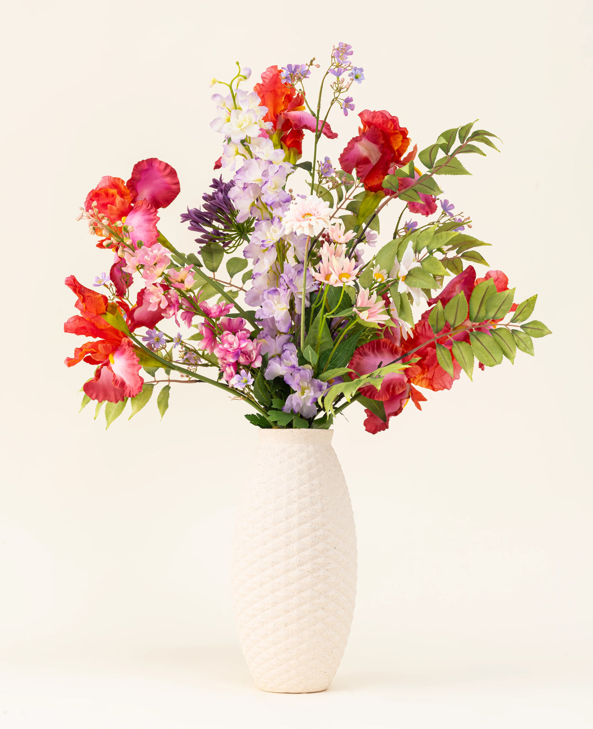 Den røde iris og lilla delphinium giver højde og intensitet, mens den lyserøde tusindfryd og bløde gerbera mini tilføjer en let charme. Den hvide lyserøde margriet og lyserøde delphinium bringer balance og romantik, suppleret subtilt...