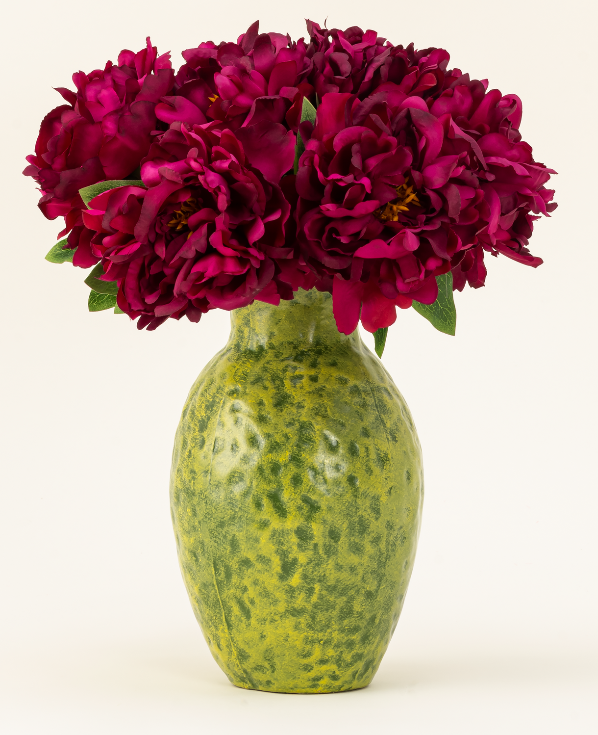 Forvandl dit rum med den smukke kunstige buket af pæoner i en dyb auberginefarve. Denne buket er ikke kun et fantastisk dekorativt element, men også en praktisk løsning til dem, der ønsker at nyde blomster uden besværet med vedligeholdelse.