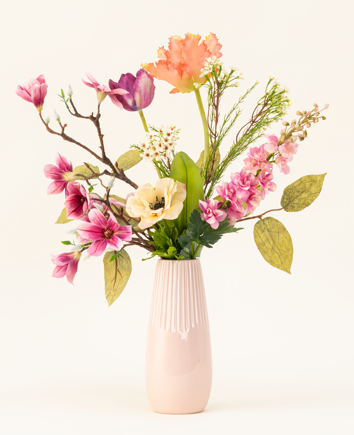 Oplev de bløde forårfarver på vores kunstbuket, år efter år. Denne fortryllende kunstige blomsterbuket kombinerer forfining og natur i en tidløs sammensætning. Den yndefulde anemone, delikat voksflower og majestætisk fransk parakeet tulp sikrer et legende og elegant look. Sammen med den robuste franske tulipan, charmerende magnolia, frisk...