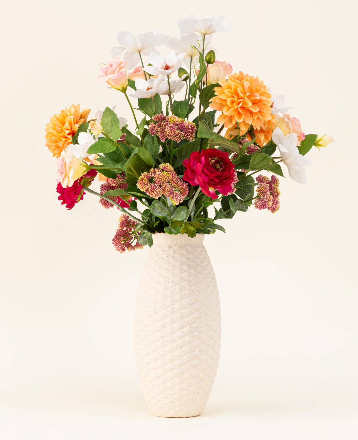 Medbring permanent skønhed med denne smukke kunstige blomsterbuket, sammensat af blomster med høj kvalitet som Real Touch Dahlia, Real Touch Eustoma, Sedum, Kantbloem, Delphinium og Ranunculus. Takket være den virkelige berøringsteknologi, Dahlias og Eustomas naturtro fornemmelse - ikke kan skelnes fra Real!