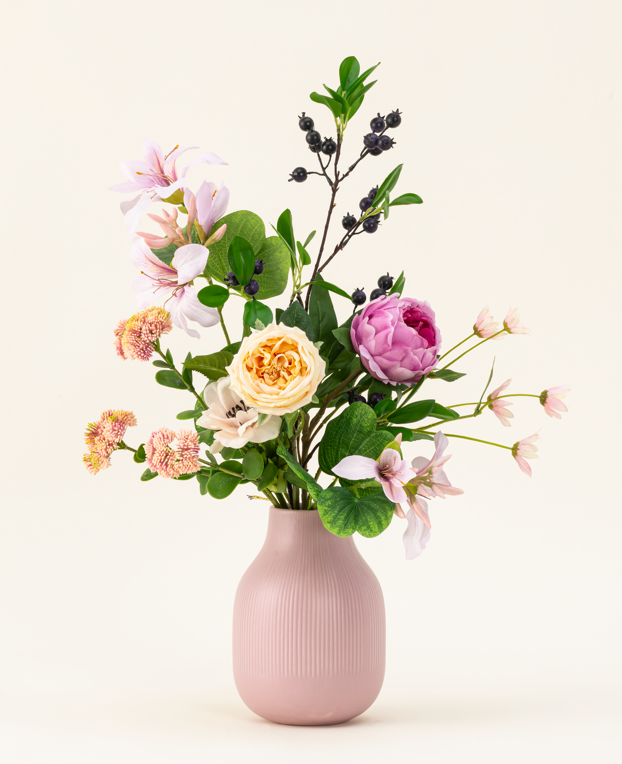 Den dybe lilla lotus -peony danner en smuk kontrast med den lyserosa rhododendron og sedumtak, mens den elegante peony og anemoon i bløde toner giver en tidløs charme. Den legende bærgren, friske aster og luftige accenter af lyserød anemoon gør denne buket til en subtil øje -fangst.
