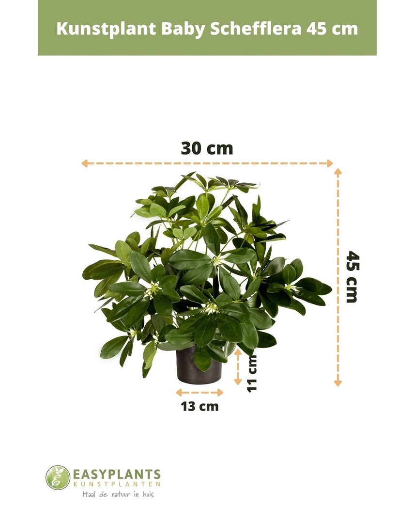Berig dit rum med den smukke kunstige plante Baby Schefflera, der står 45 cm høj. Uanset om det er i hjemmet, i en butik, en skole eller på kontoret, tilfører denne plante et friskt og naturligt udtryk til enhver indretning.