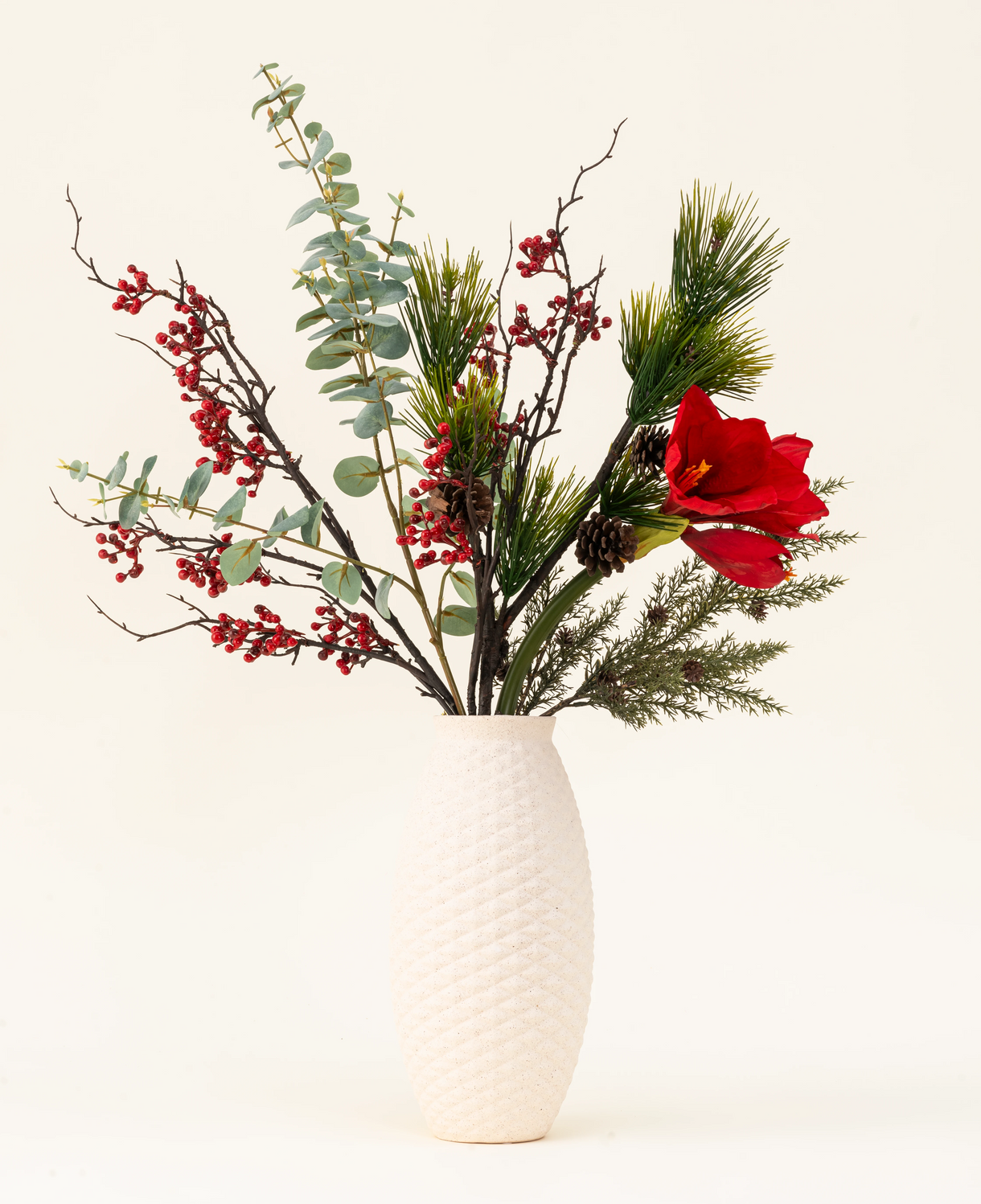 Den røde amaryllis er det strålende midtpunkt og giver buketten et rigt, klassisk look. De røde bær giver et festligt og legende touch, mens eukalyptus giver en frisk, grøn base. De sorte fyrretræer og fyrrenåle giver naturlig dybde og tekstur og får buketten til at se robust...